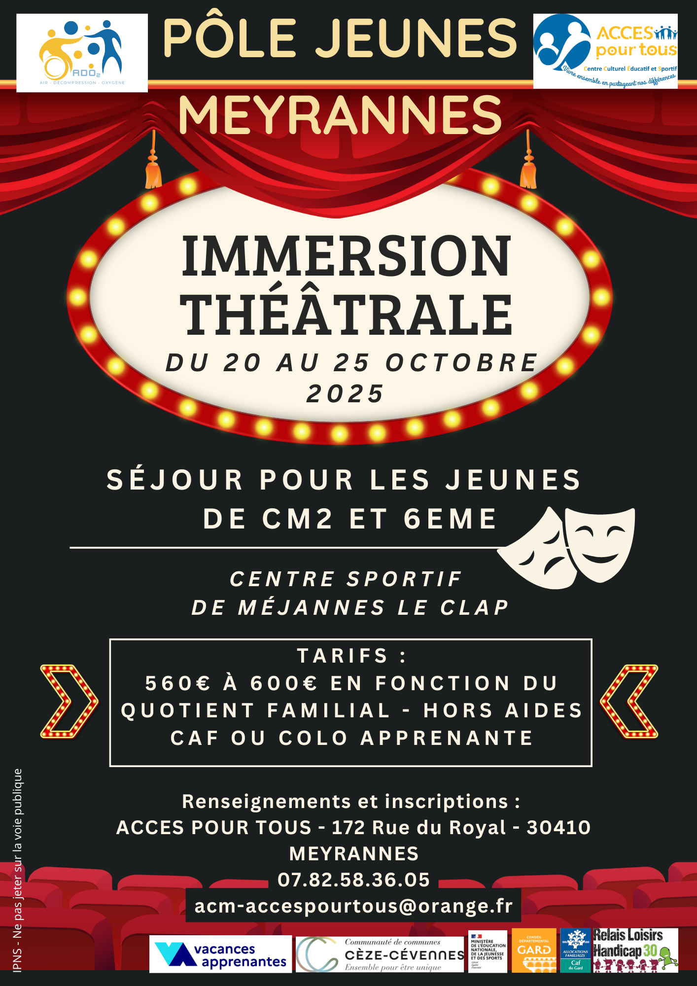 Le Territoire Éducatif Rural de Cèze Cévennes organise, pour tous les élèves de CM2 et de 6ᵉ, une colo apprenante intitulée « Immersion théâtrale ». Ce séjour aura lieu du 20 au 25 octobre 2025 au centre sportif de Méjannes-le-Clap.